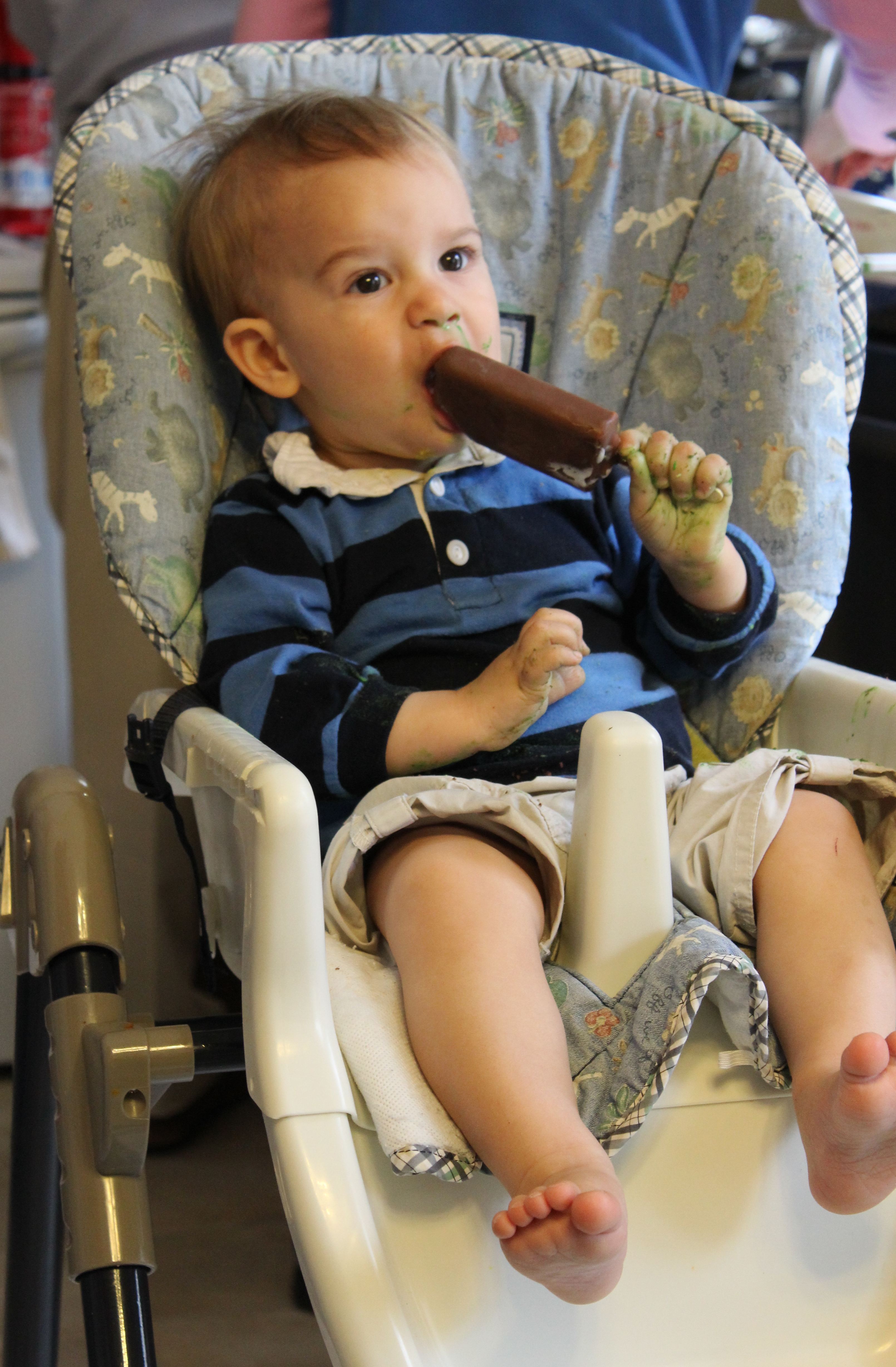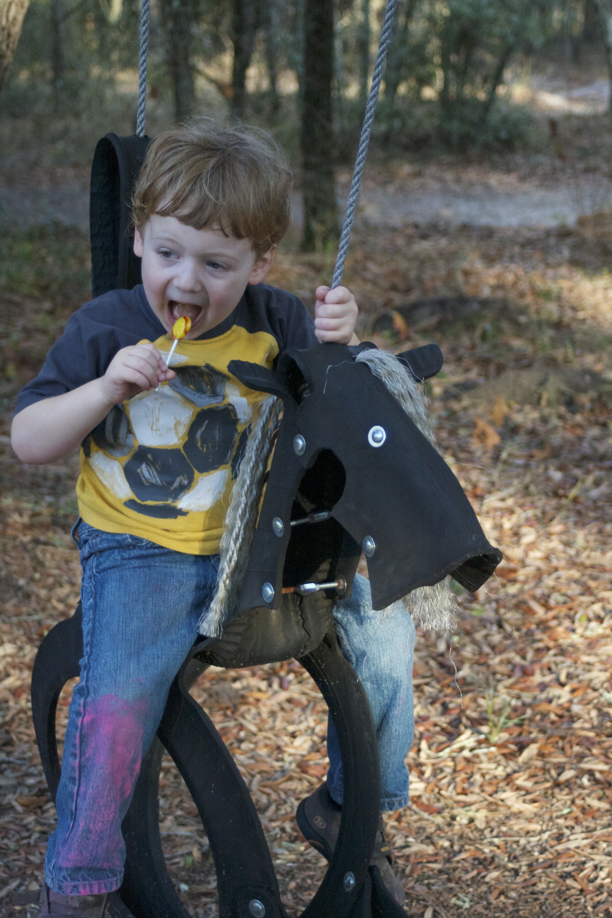 A lollipop, a tire horse swing, some sidewalk chalk on the pant legs: more elements of a very good day.