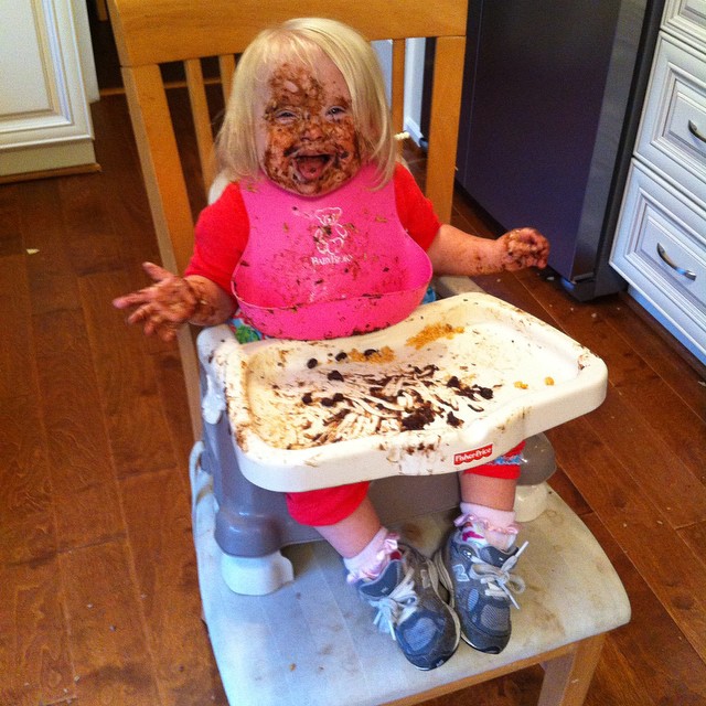 - Is starting to come out of a very picky eating stage. She is gradually eating more veggies and fruits again, although the veggies usually still have to be snuck into her food or wind up being cleaned off the floor by the dog. Her favorite foods are cheese (a word she signs and says often), pretty much any kind of bread, avocado, beans, banana, watermelon, snacks like crackers or nuts, and anything sweet. Throwing food is still a real problem, and mealtimes are terribly messy affairs. (See exhibit A below.)